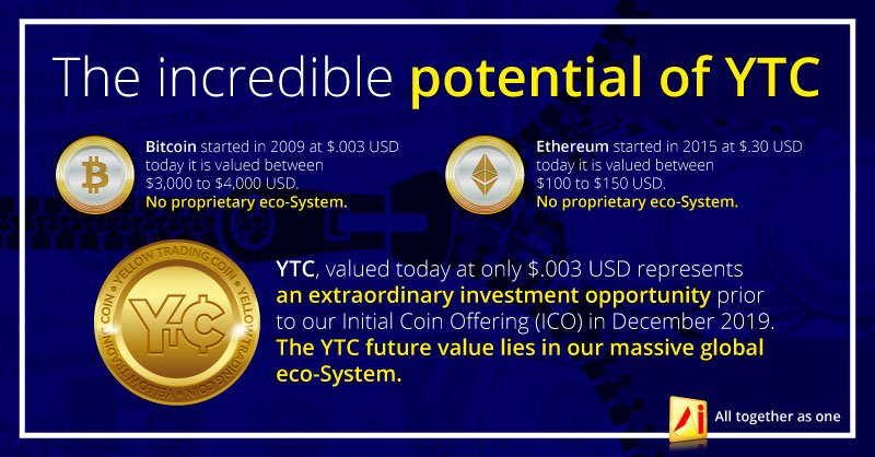 The creation and implementation of the YTC Token are to support, embellish and accelerate the daily growth of the AiYellow eco-System. The YTC Token will provide a simple and clear path for individuals who have a desire to participate in the cryptocurrency phenomena. Anchored by its core businesses, AiYellow seeks to create an entirely new culture offering the exchange of YTC Tokens.
